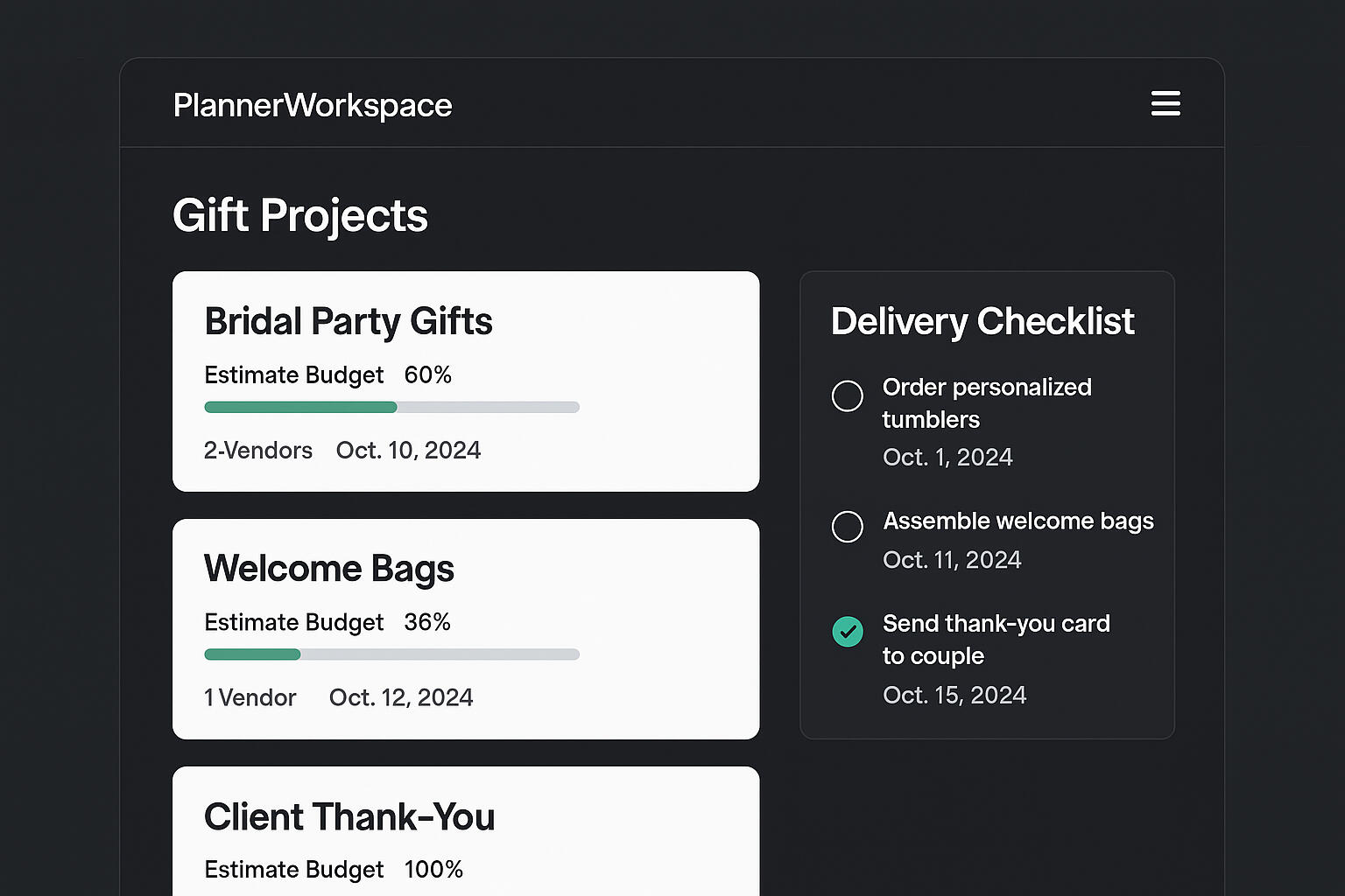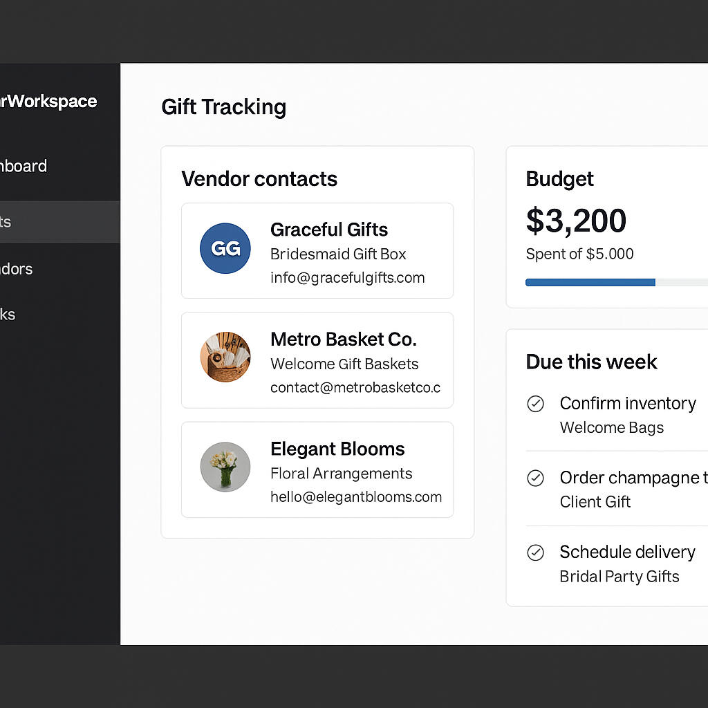 PlannerWorkspace keeps every detail in order — budgets, vendors, tasks, and delivery dates — so you can move from idea to execution without missing a beat.Whether you’re sending welcome bags to 100 guests or a thank-you gift to the couple, you’ll know exactly what’s done, what’s pending, and what’s next.